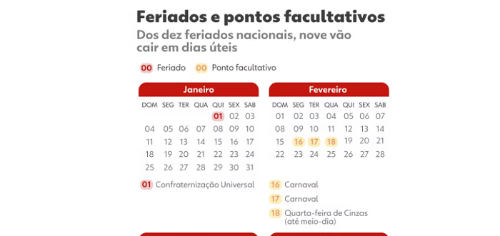 A administração pública lançou uma normativa contendo a relação de feriados e dias de falta facultativa para 2026. O cronograma foi apresentado na mais recente edição do Diário Oficial da União.