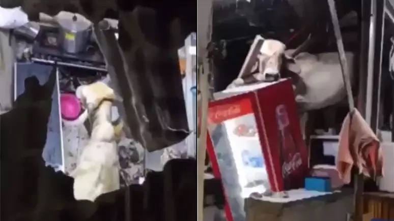 Vaca fujona cai sobre telhado de bar, e despenca na cozinha