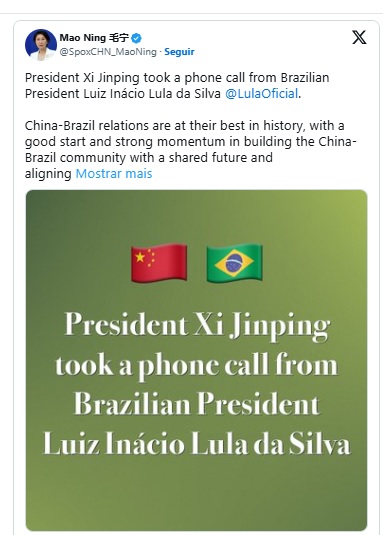 A representante do Ministério das Relações Exteriores da China, Mao Ning, declarou nesta terça-feira (12) que é a favor da proteção da soberania do Brasil, após uma conversa telefônica entre os presidentes Luiz Inácio Lula da Silva (PT) e Xi Jinping.