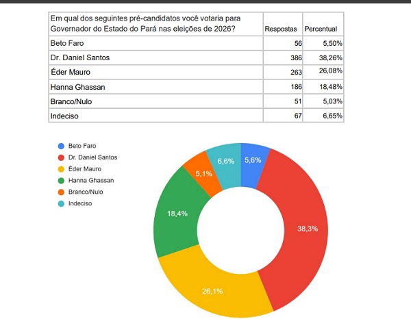 Para o governo do Estado, o prefeito de Ananindeua, Dr. Daniel Santos (PSB), lidera a disputa de intenção de votos, com 38,26%; seguido do deputado federal Éder Mauro (PL) com 26,08%; em terceiro, a vice-governadora Hanna Ghassan (MDB) com 18,485; em quarto, senador Beto Faro (PT) com 5,5 %.