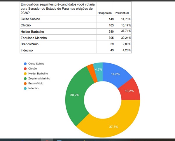 Para o senado, a pesquisa alcançou a liderança do governador Helder Barbalho (MDB) com 37,71%; em segundo, aparece o senador Zequinha Marinho (Podemos) com 30,24%; em terceiro, o ministro do Turismo Celso Sabino (UB) 14,73%; e em quarto, o presidente da AL, deputado Chicão (MDB) com 10,17%.