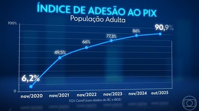 A pesquisa aponta que 93% dos adultos no Brasil utilizam o Pix, o que corresponde a mais de 170 milhões de indivíduos, um número que ultrapassa a quantidade de usuários de cartões de crédito, que é de 153,4 milhões.
