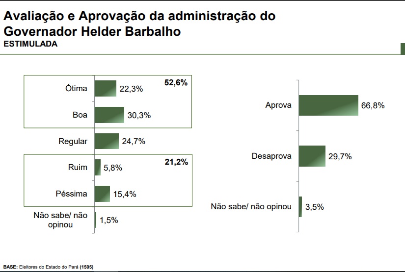 Na pesquisa sobre Avaliação e Aprovação da administração do Governo do Estado, Helder Barbalho atinge 52,6% de Ótima e Boa; e é aprovada por 66,8% dos entrevistados nos municípios.
