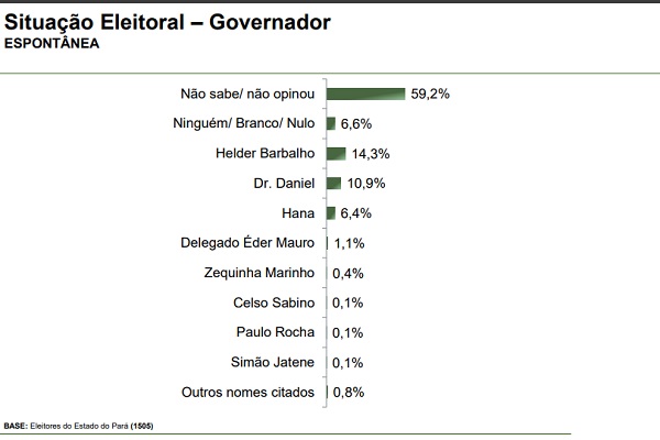 Para o governo, nas respostas espontâneas, Dr. Daniel fica atrás apenas do atual governador Helder Barbalho (citado por 14,3% dos entrevistados), que disputará o Senado. Daniel obteve 10,9% – seguido pela atual vice-governadora Hana (6,4%); Delegado Éder Mauro (1,1%); senador Zequinha Marinho (o,4%); ministro Celso Sabino (0,1%); ex-senador Paulo Rocha (0,1%); ex-governador Simão Jatene (0,1%) .