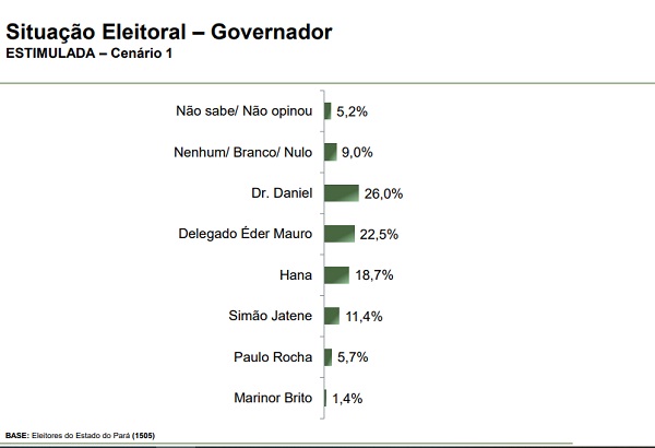 Na pesquisa estimulada (cenário 1), Dr. Daniel lidera a preferência do eleitorado paraense com 26% de citações. Em segundo, surge Éder Mauro(PL) com 22,5%; em terceiro está a vice-governadora Hana, citada por 18,7% dos consultados. Em quarto lugar, neste cenário, o ex-governador Simão Jatene obtém 11,4%, seguido de Paulo Rocha, 5,7% e Marinor Brito (Psol) com 1,4%.
