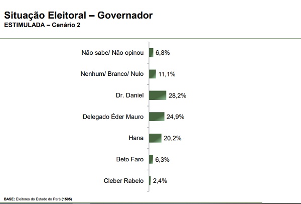 Em outro cenário, sem a inclusão de alguns nomes colocados na Estimulada 1, Dr. Daniel cresce mais ainda, obtendo 28, 2%, seguido de Eder Mauro 24,9%; Hana, 20,2%; senador Beto Faro (PT), 6,3%; e Cleber Rebelo, 2,4%.