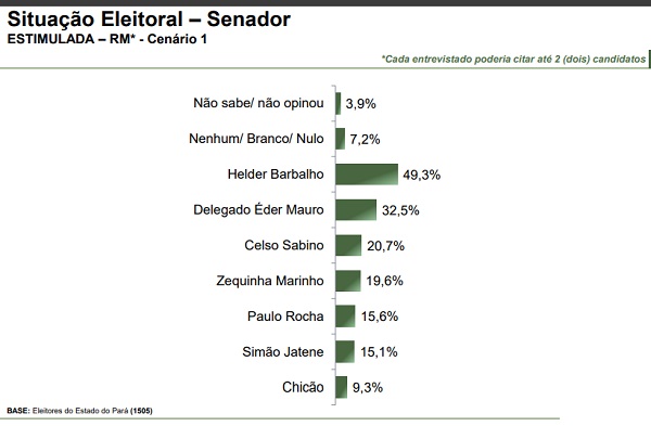 O Paraná ouviu também a preferência atual pelos pré-candidatos ao Senado. O governador Helder Barbalho lidera com certa tranquilidade em dois cenários posicionados pelo instituto, obtendo 49,3% e 54,2%, quando o questionário exclui o nome do deputado federal Eder Mauro.