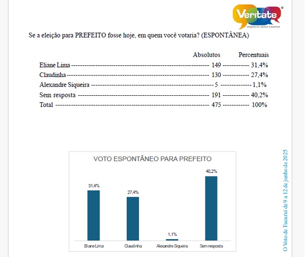 Em comparação ao resultado da eleição de 2024 quando Eliane Lima disputou o pleito contra o prefeito recentemente cassado, Alexandre Siqueira, ela aparece na pesquisa do Veritate com avaliação bem superior aos votos obtidos naquela disputa.