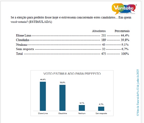Na pesquisa estimulada, Eliane Lima lidera com 44,4%; em segundo, Claudinha, citada por 39,8 eleitores ouvidos.
