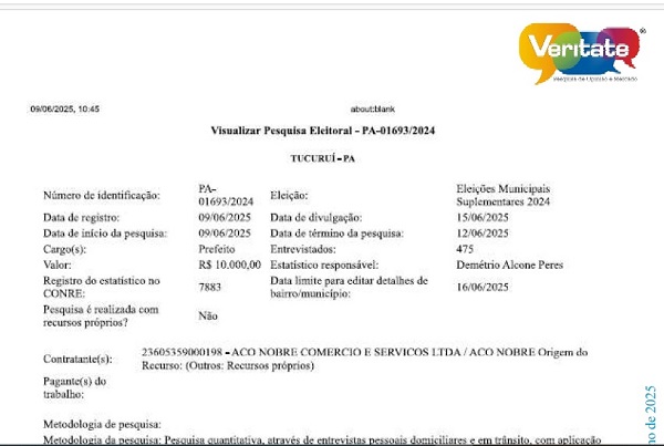 Primeira pesquisa do instituto Veritate realizada em Tucuruí, auscultando o humor do eleitorado do município em relação a eleição suplementar marcada para 3 de agosto próximo, aponta a candidata Eliane Lima, do Partido Liberal, à frente da disputa contra Claudinha, do MDB.
