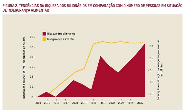 Trata-se do relatório “Resistindo ao domínio dos ricos”. Nele, a organização internacional revela que a riqueza coletiva dos bilionários cresceu 2,5 trilhões de dólares em 2025, alcançando 18,3 trilhões de dólares, o maior valor já registrado. Esse crescimento foi três vezes mais rápido do que a média dos últimos cinco anos. Já o número de bilionários ultrapassou 3.000 pessoas pela primeira vez.